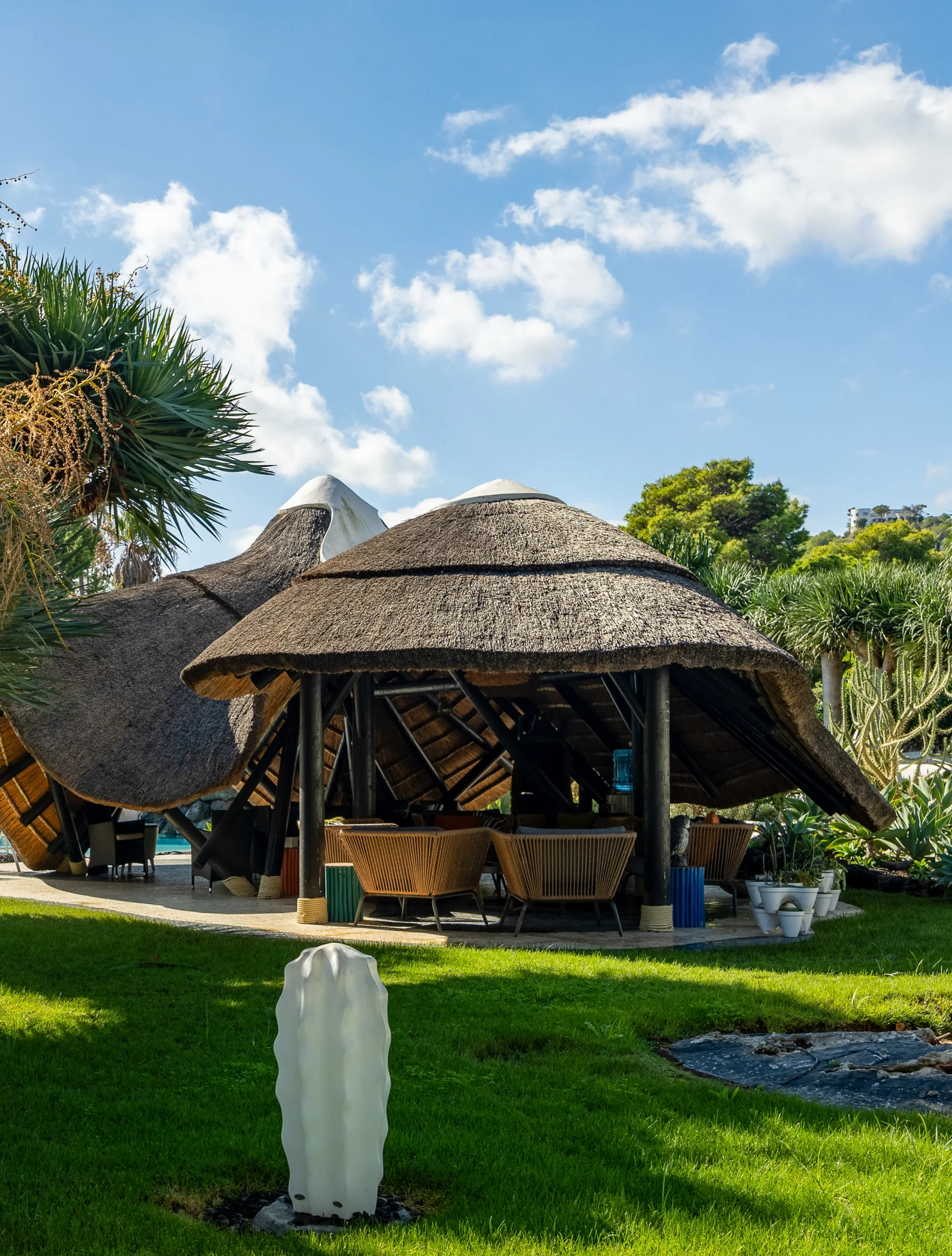 El exterior se ha concebido como una auténtica composición mediterránea, donde un jardín desértico de gran belleza, una piscina tipo laguna, zonas de sombra y una singular palapa con cocina de verano crean un escenario excepcional para vivir al aire libre.