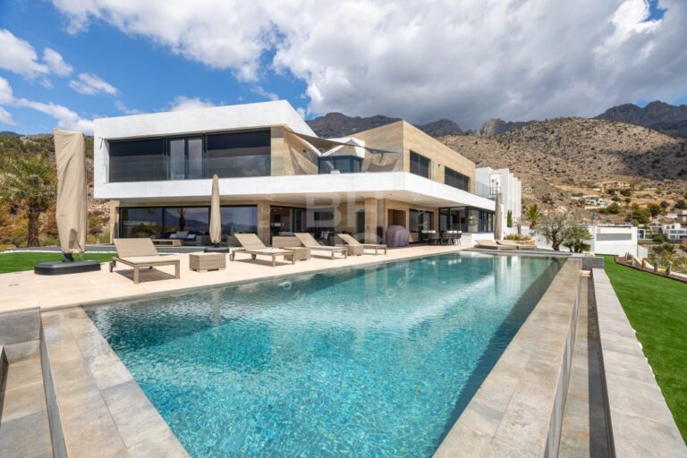 Entdecken Sie unvergleichliche Eleganz in dieser exklusiven Luxusvilla, die zum Verkauf in Altea steht. Sie befindet sich in einer einzigartigen Lage auf einem Hügel und bietet einen weiten Blick auf das Mittelmeer, die majestätischen Berge und die pulsierende Skyline von Benidorm. Diese außergewöhnliche Immobilie ist so konzipiert, dass sie erstklassige natürliche Oberflächen wie Holz und Marmor mit raffinierten Einrichtungselementen von Roberto Cavalli verbindet und so eine Umgebung von unvergleichlichem Luxus und Komfort schafft.