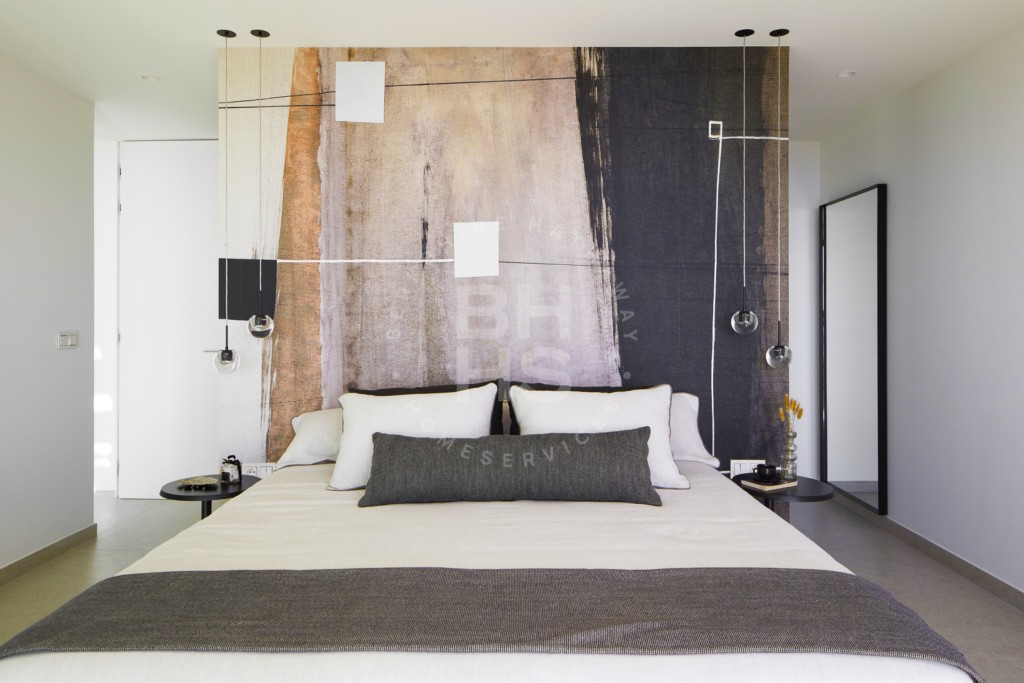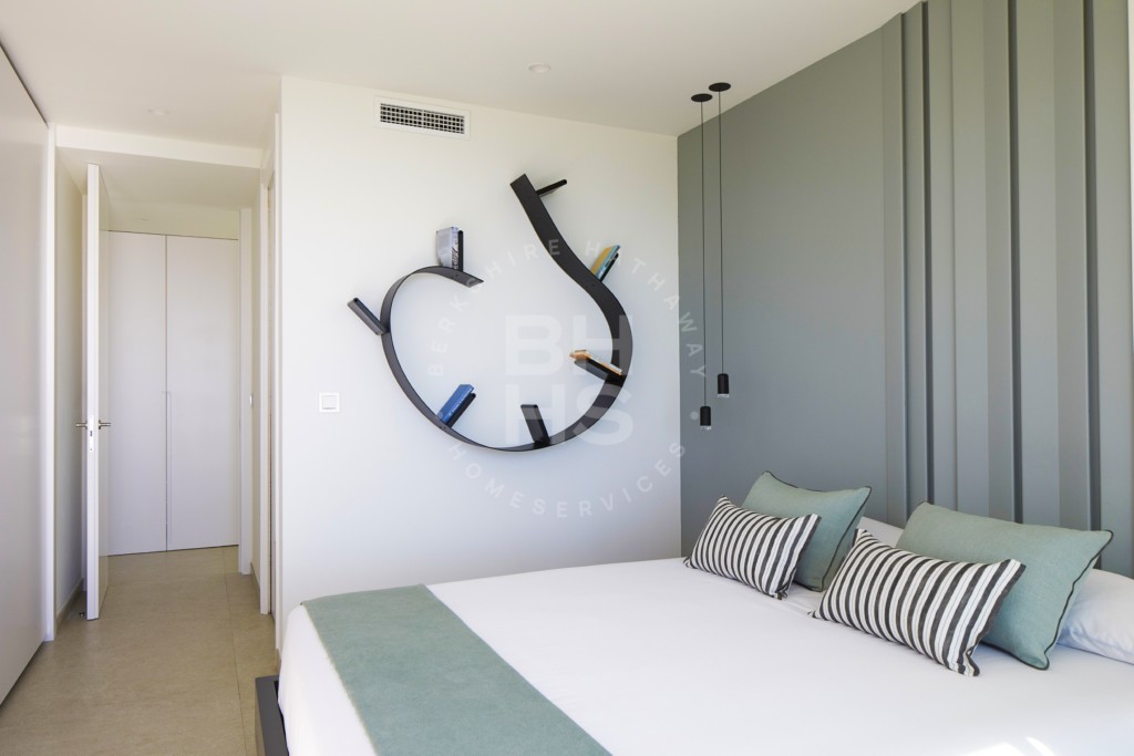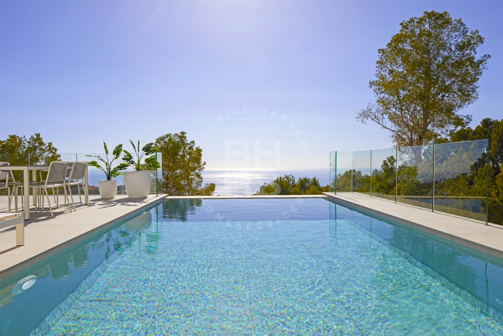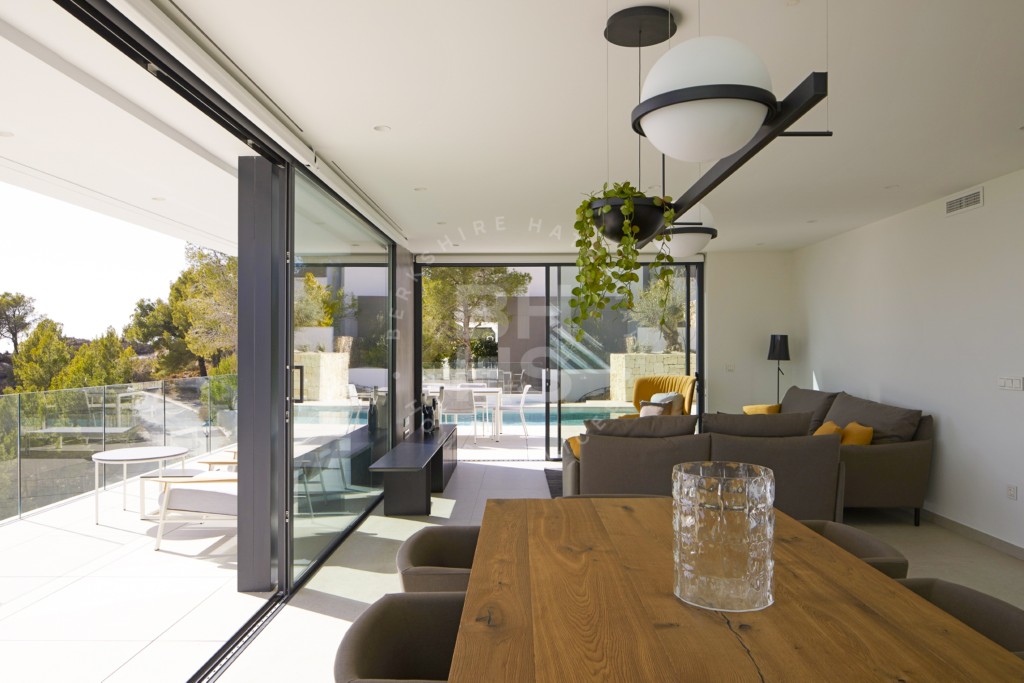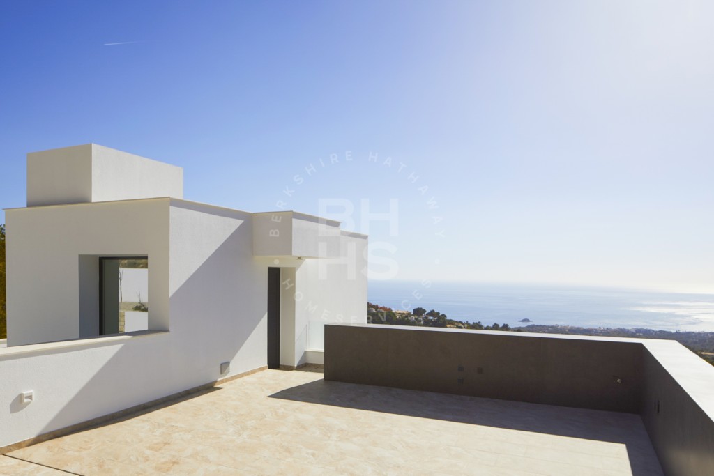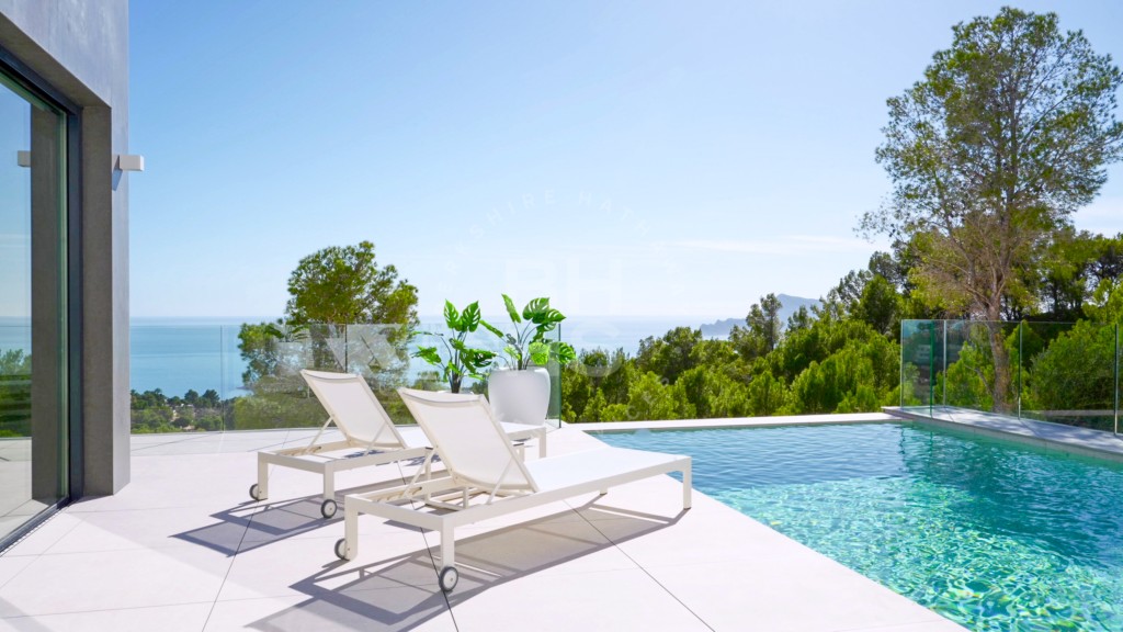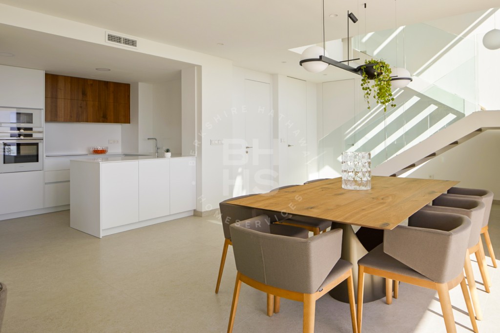 Das Hauptgeschoss ist in zwei verschiedene Bereiche unterteilt, die durch den Flur und den Treppenhauskern getrennt sind. Auf der einen Seite befindet sich das vierte Schlafzimmer mit eigenem Bad, begehbarem Kleiderschrank und direktem Zugang zur Hauptterrasse mit überdachtem Verandabereich. Auf der anderen Seite laden die offen gestaltete Küche und der Essbereich zu kulinarischer Kreativität und geselligem Beisammensein ein. Die Küche ist mit einer zentralen Kochinsel, einer Kochzone und einer Frühstücksbar ausgestattet und geht in den Essbereich und ein helles, luftiges Wohnzimmer über. Diese Räume sind dank der großen Fenster, die eine nahtlose Verbindung zwischen Innen- und Außenbereich ermöglichen, in natürliches Licht getaucht. Die weitläufige Terrasse mit mehreren überdachten Veranden, einem Gästebad im Freien und einem atemberaubenden Infinity-Pool sorgt dafür, dass das Mittelmeer immer in Sichtweite bleibt.