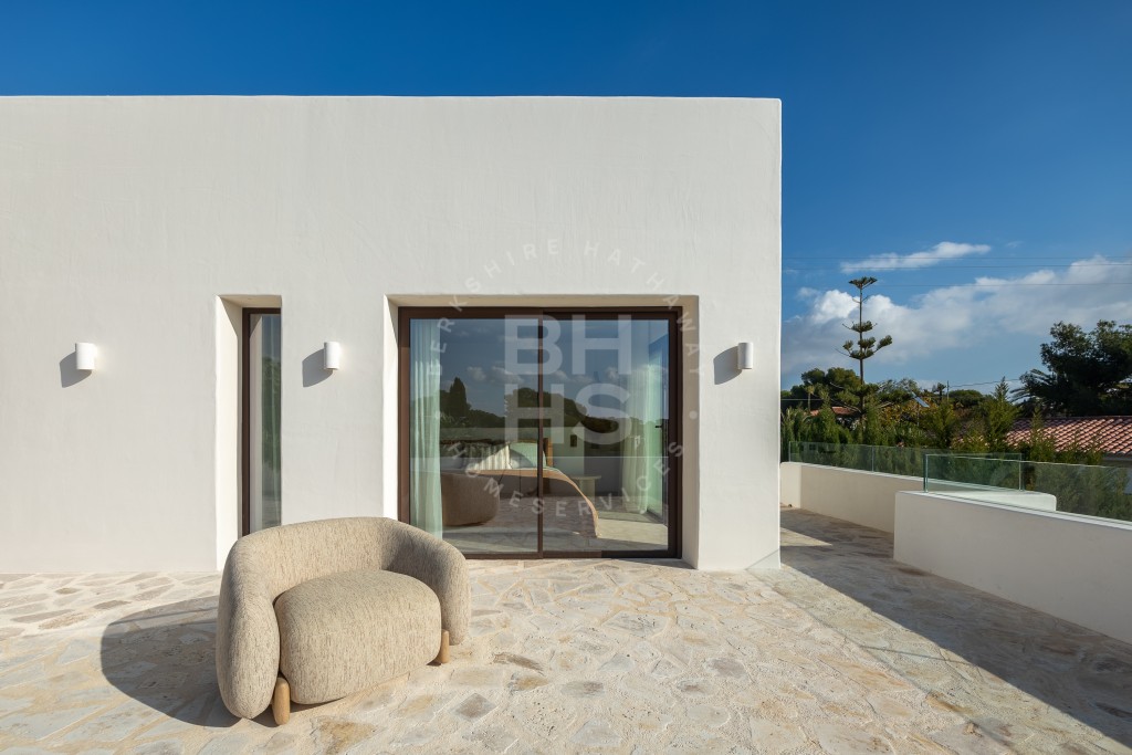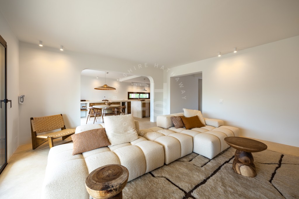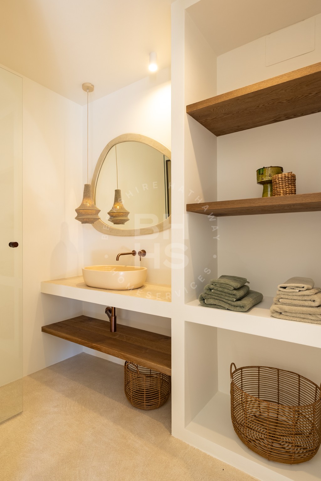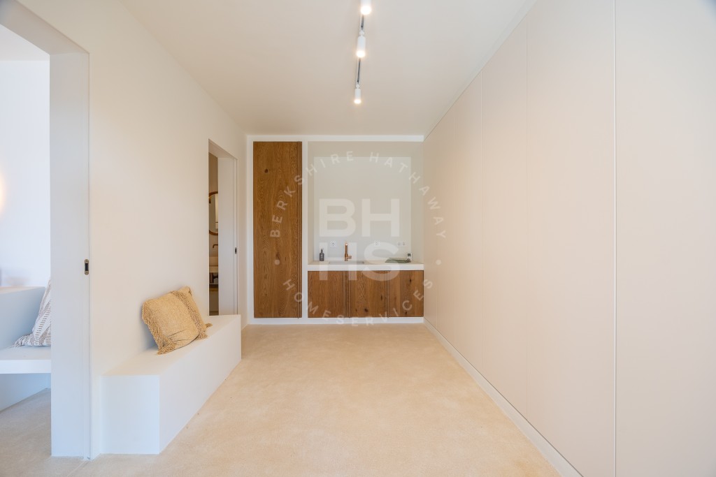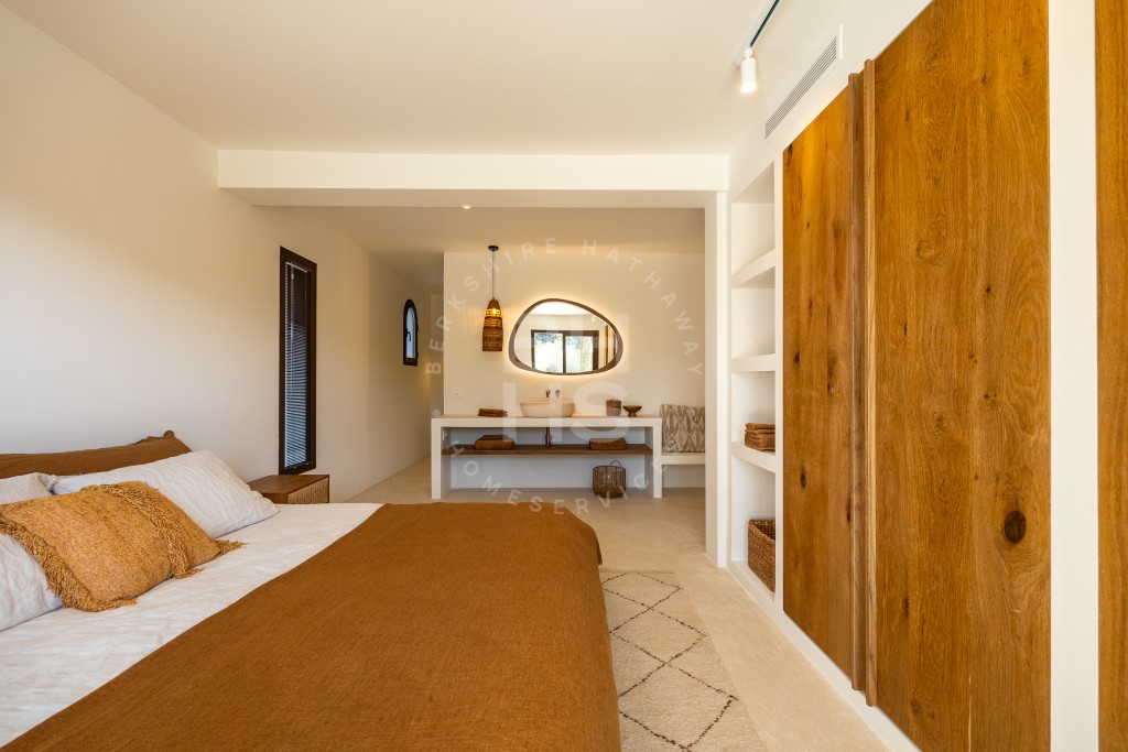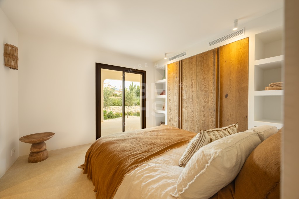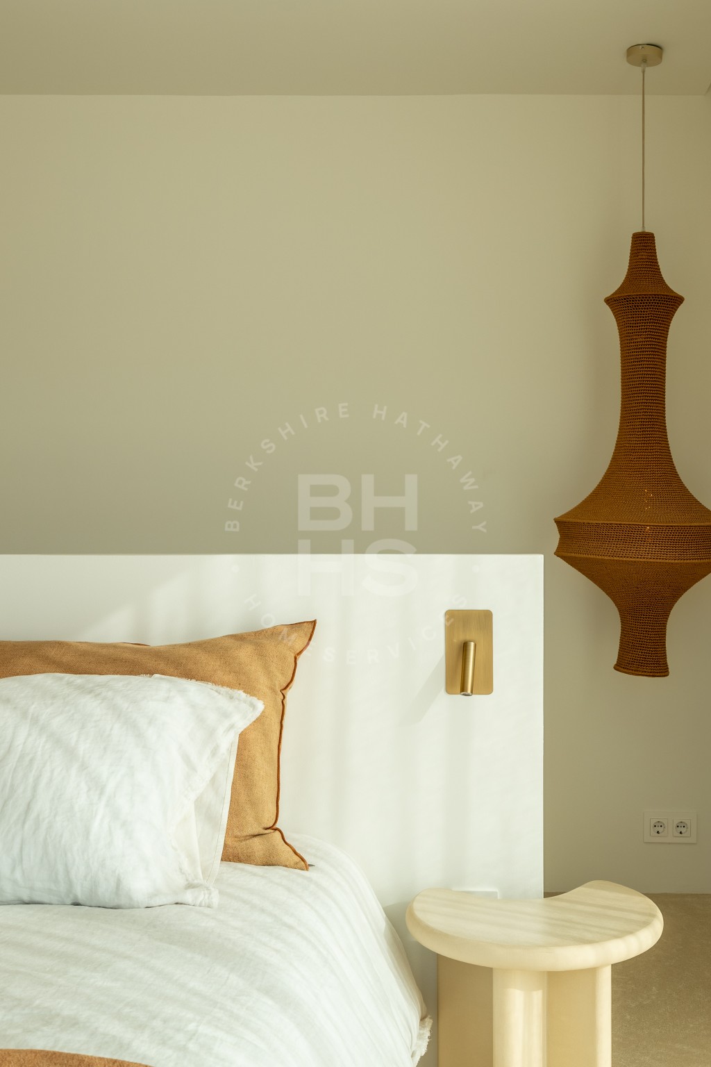Inside, the home radiates authenticity with high-quality finishes, earthy tones, and natural materials inspired by wabi-sabi principles. Underfloor heating and integrated air conditioning ensure a pleasant indoor climate throughout the year, while expansive windows seamlessly connect the interior with the Mediterranean landscape. Every room offers a sense of space and serenity, making the villa not only a residence but a sanctuary.