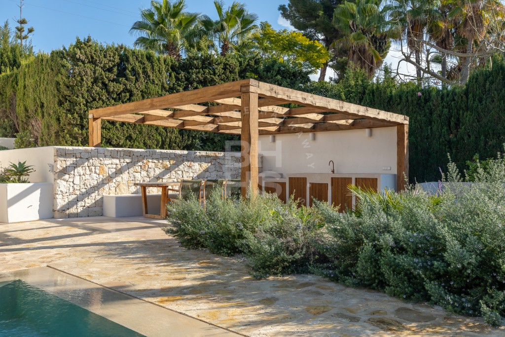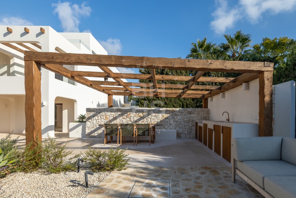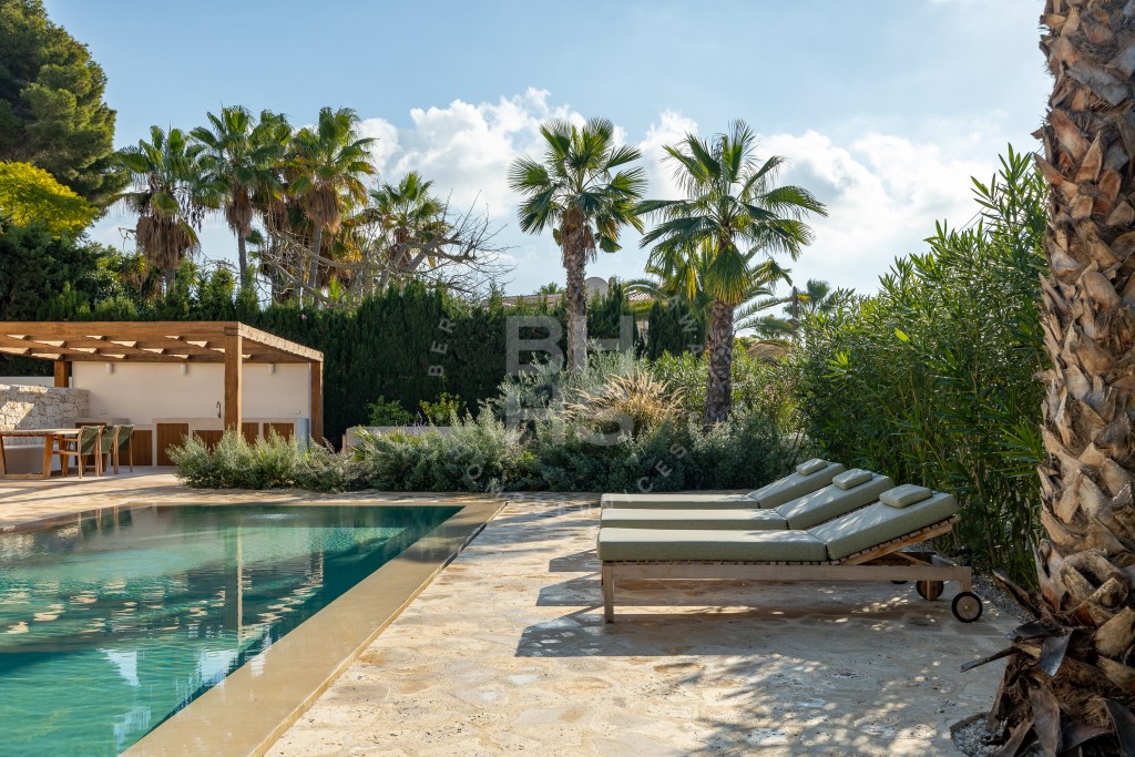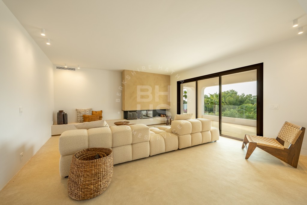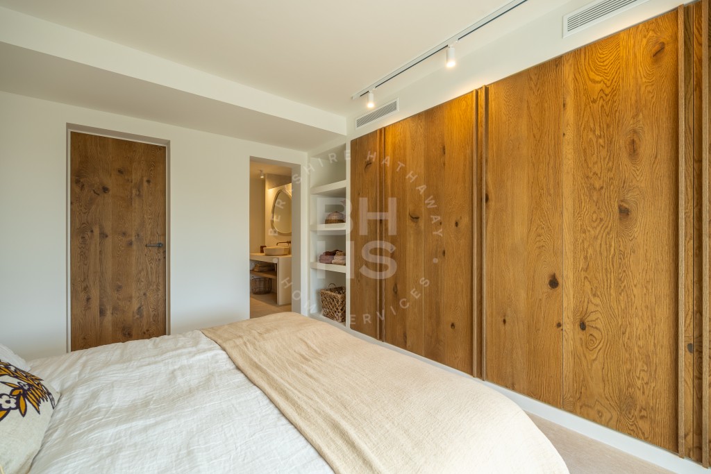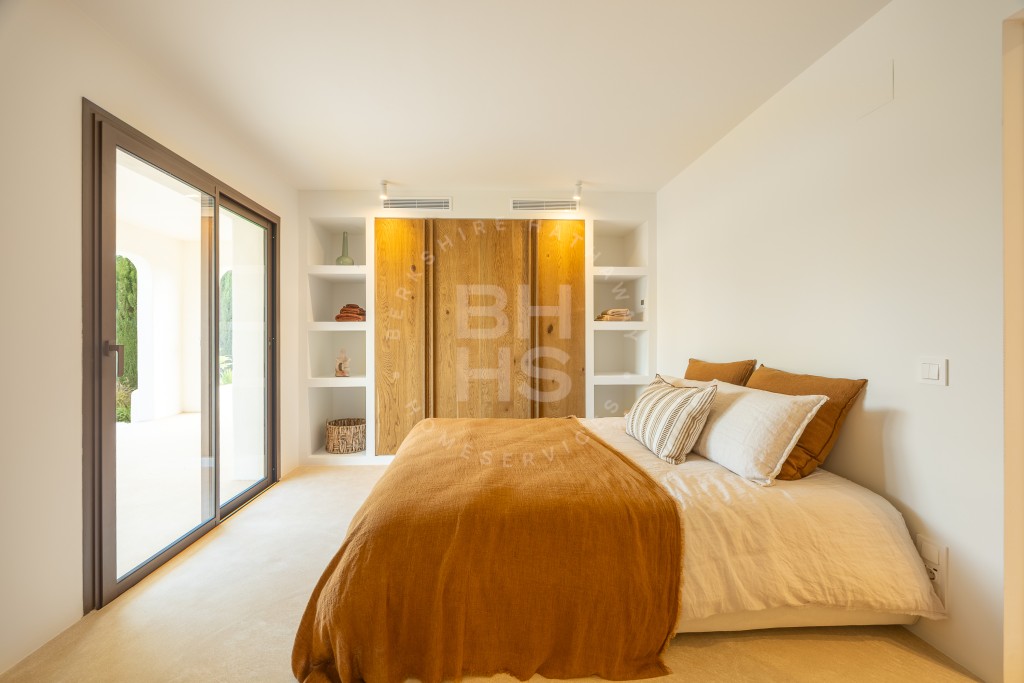From the moment you step inside, you are welcomed by an atmosphere of calm and refined simplicity. The villa features five spacious bedrooms, each with its own en-suite bathroom, making it ideal for families or for hosting friends with complete privacy and comfort. Sun-drenched terraces surround the home, creating inviting spaces for morning coffee, long summer lunches, or tranquil evenings overlooking the beautifully designed outdoor areas. The leisure zones around the villa encourage relaxation and effortless entertaining, allowing every gathering to feel special.