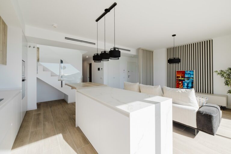 With four spacious bedrooms and three elegantly finished bathrooms, this penthouse ensures privacy for all family members and visiting guests. Two en-suite bedrooms provide a peaceful retreat, featuring direct terrace access where you can enjoy sunrise coffee or quiet evenings under the stars. The fully equipped modern kitchen offers premium appliances and clean design, perfect for preparing meals to enjoy indoors or outdoors on the terrace.