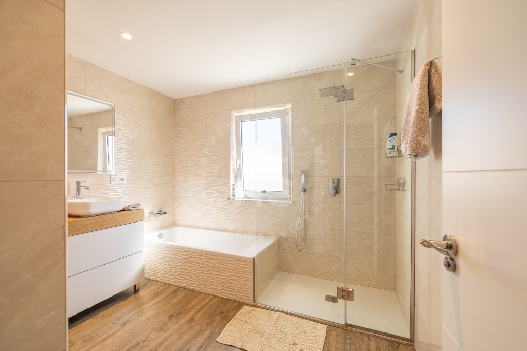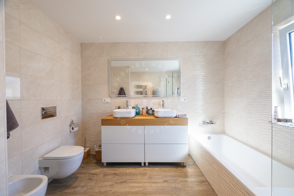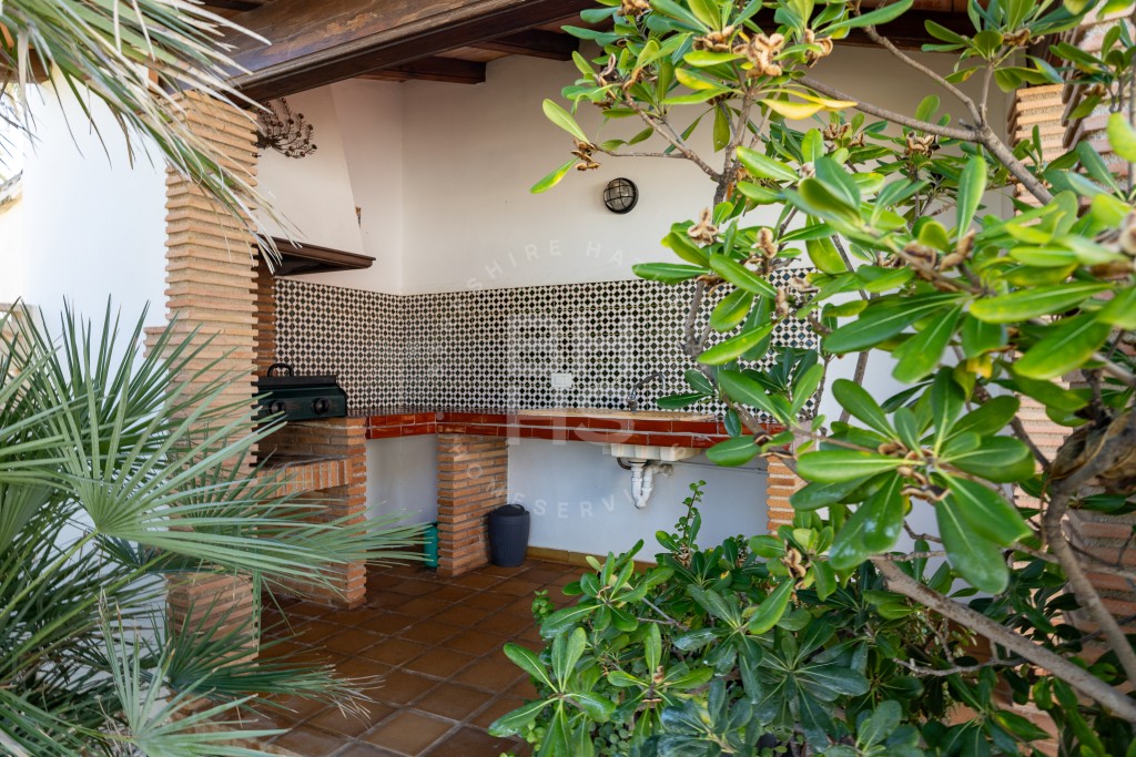 De villa heeft een oppervlakte van 346 m² en beschikt over vier ruime tweepersoonsslaapkamers, waaronder een luxe master suite met een moderne en-suite badkamer en een inloopkast. Twee extra badkamers vullen het verfijnde ontwerp aan. De open woon- en eetkamer, badend in natuurlijk licht, heeft een gezellige open haard en grote ramen die naadloos aansluiten op een eigentijdse keuken – perfect om te entertainen of te genieten van intieme familiemomenten.