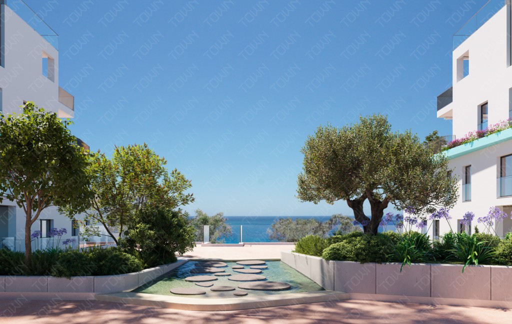 Stap je nieuwe huis binnen en voel direct de warmte en het licht. De gevel, die bestaat uit strakke witte tinten, weerspiegelt de zuiverheid van de mediterrane kustlijn, terwijl het ontwerp zowel thermische als akoestische isolatie garandeert voor comfort het hele jaar door. Het interieur is voorzien van hoogwaardige porcellanato vloeren in de woonkamer, keuken en slaapkamers, die een vleugje verfijnde elegantie toevoegen aan elke stap. De badkamers hebben een opvallende, moderne afwerking en antislip porcellanato op terrassen en balkons – ideaal voor ontspannen ochtenden bij de zeebries.
