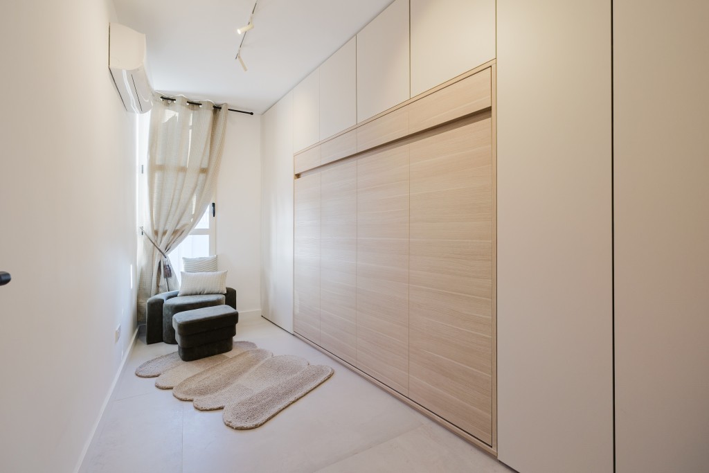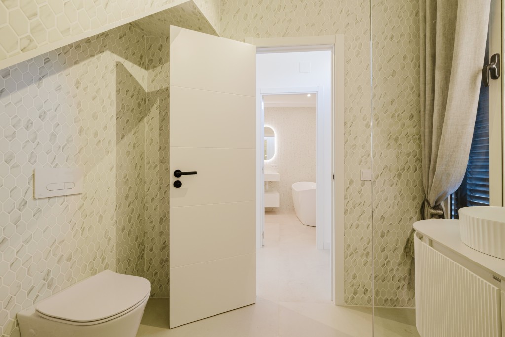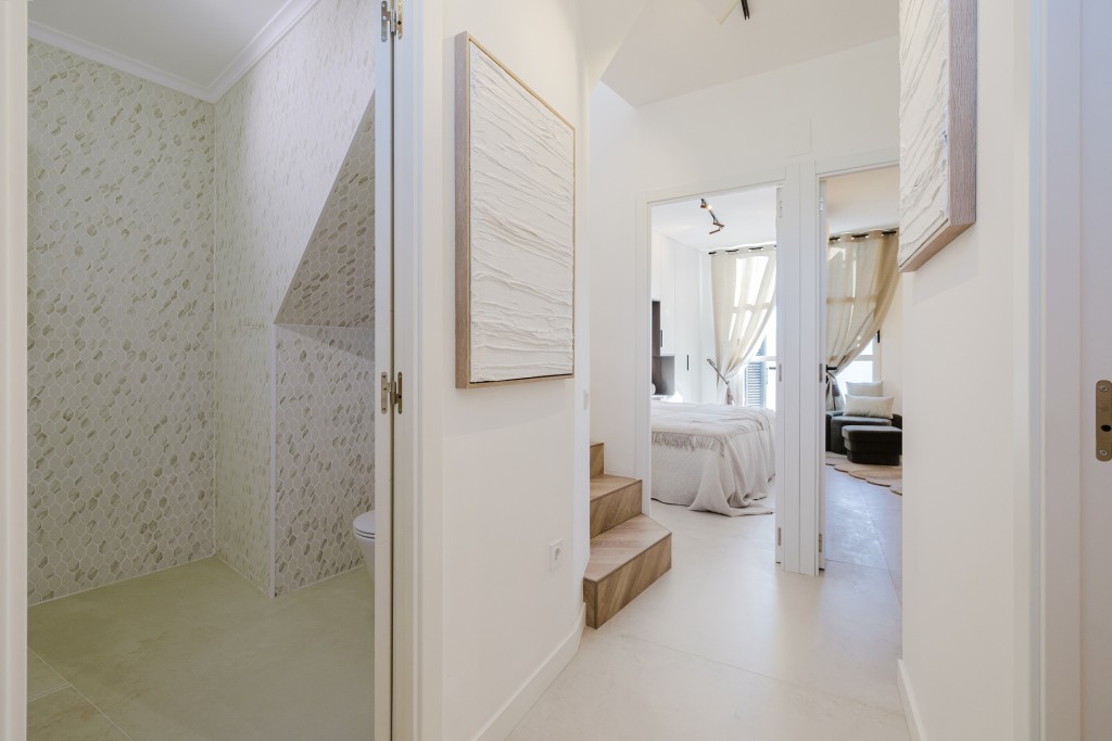 La cocina monocromática está totalmente equipada con electrodomésticos de primera calidad, incluida una combinación de lavadora y secadora, lo que garantiza tanto el estilo como la practicidad. La planta superior, a la que se accede por unas cálidas escaleras de madera, está bañada por la luz natural, creando un ambiente acogedor donde la familia y los invitados pueden relajarse y disfrutar de cada momento.