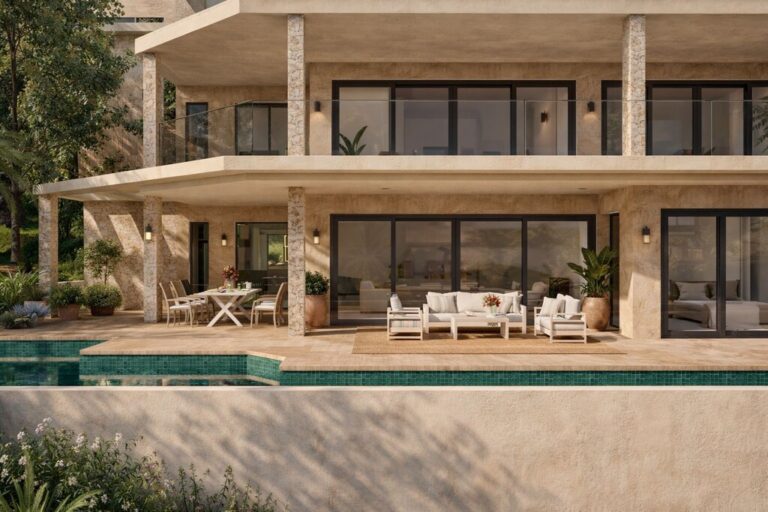 El nivel principal se abre a la perfección a una amplia terraza donde una tentadora piscina es la protagonista, enmarcada por el mar Mediterráneo como telón de fondo diario. Ya sea para disfrutar de una velada bajo las estrellas o de un apacible baño matutino, esta zona exterior está hecha para vivir momentos memorables.