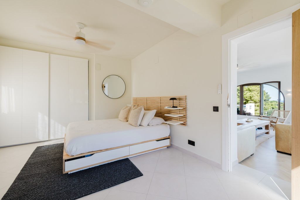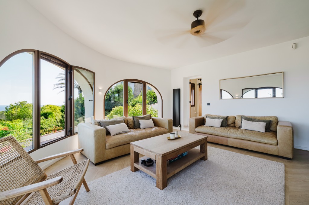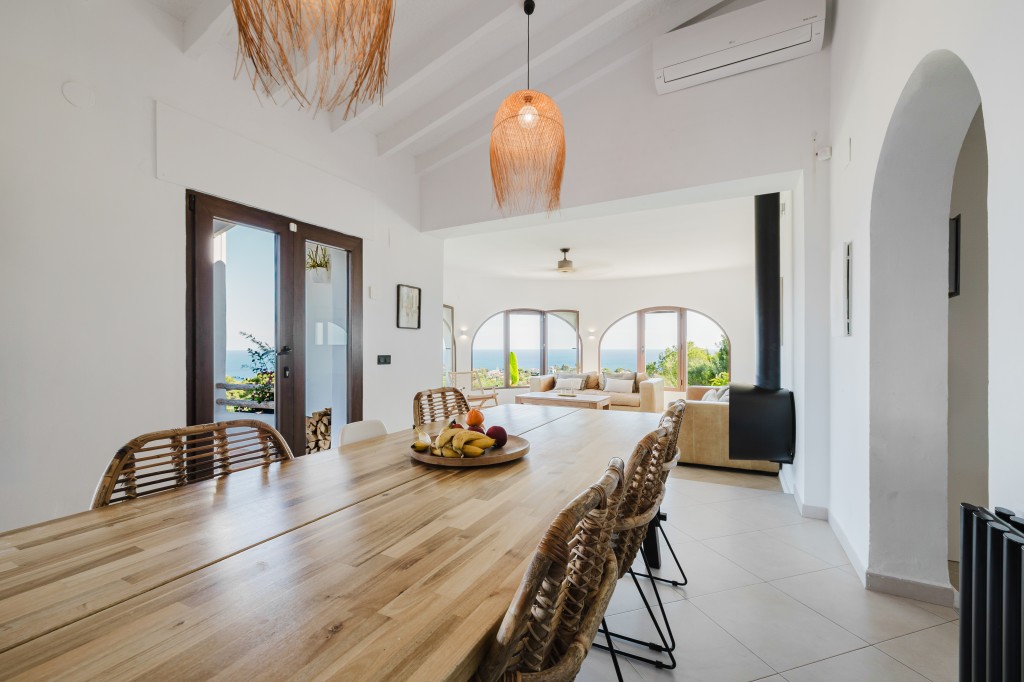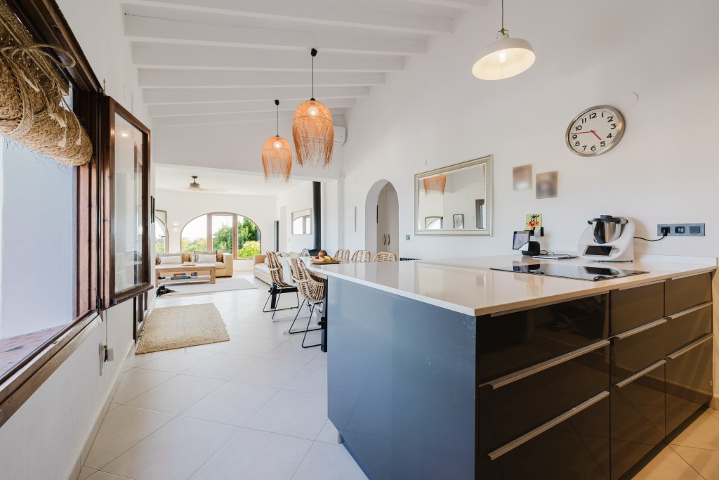 El corazón de la villa late en su cocina de concepto abierto y en el amplio salón-comedor, donde la luz natural fluye gracias a grandes ventanales y techo que enmarcan el Mediterráneo como si fuese una obra de arte en constante movimiento. Desde el amanecer hasta el atradecer, cada rincon de esta bonita pieza invita a compartir momentos en familia y con amigos: desayunos soleados, cenas al aire libre, tardes de lectura con la brisa marina y celebraciones inolvidables bajo el cielo estrellado.