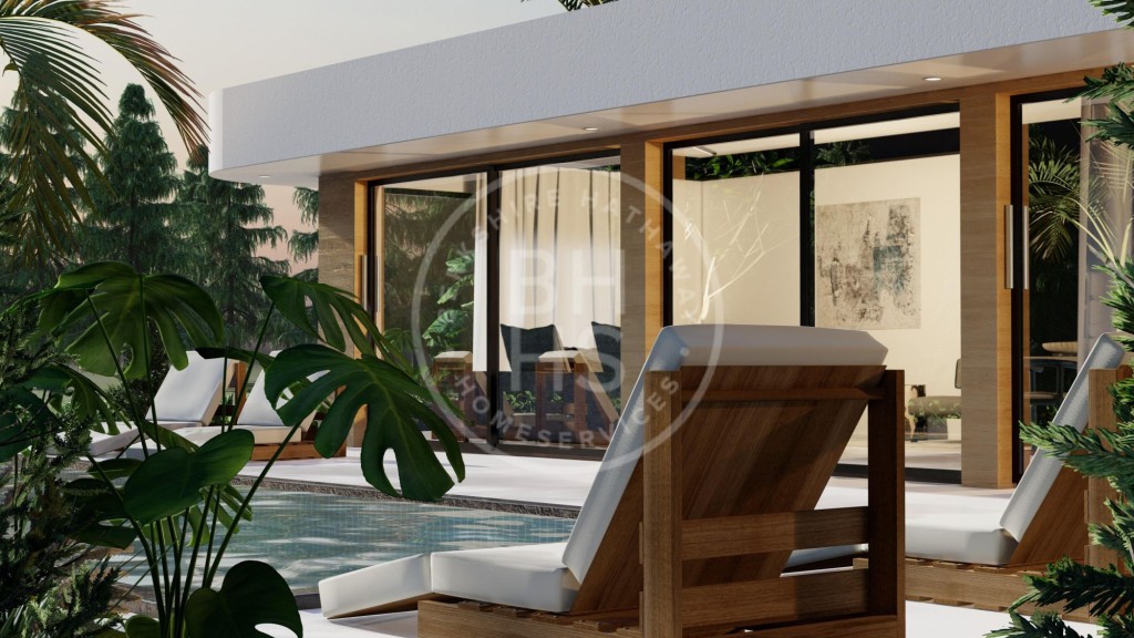 La villa cuenta con tres dormitorios y dos baños completos, distribuidos en dos niveles. En la planta principal se encuentran las áreas comunes —salón, comedor y cocina— concebidas bajo un concepto abierto que potencia la fluidez entre los espacios y fomenta un estilo de vida relajado y funcional. La cocina, moderna y completamente equipada, se distingue por su diseño minimalista y sus materiales de alta calidad, ofreciendo tanto funcionalidad como una estética impecable.