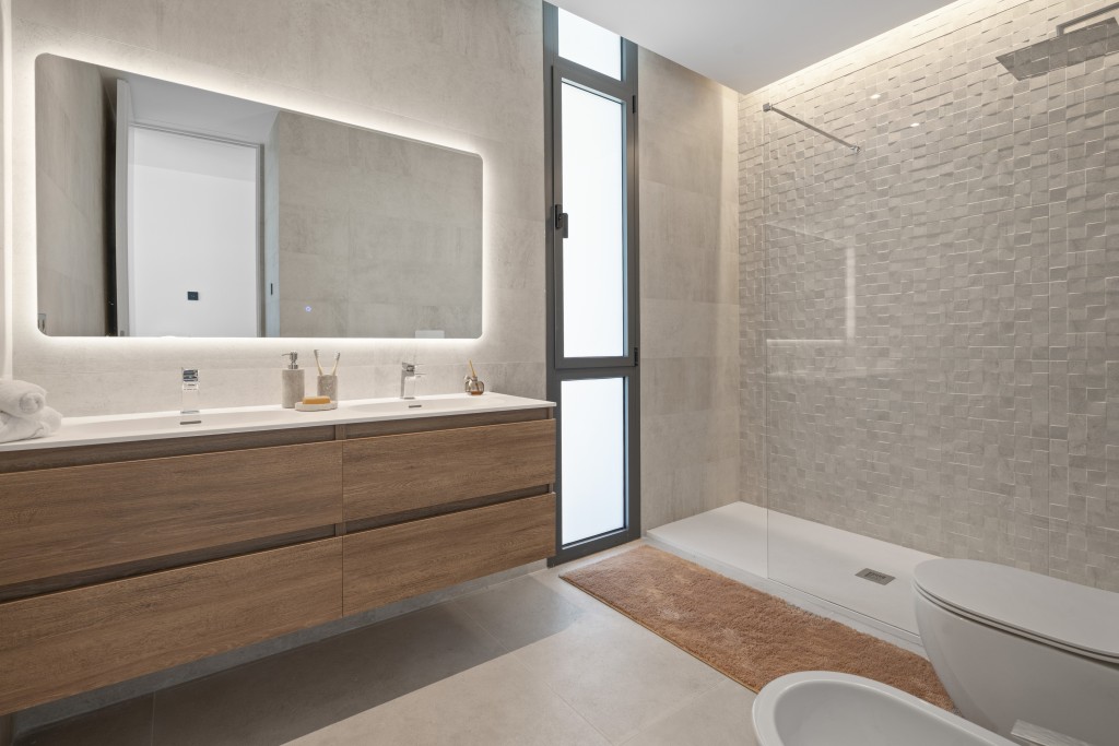 Las especificaciones interiores son inequívocamente de primera calidad. Suelos de porcelana Porcelanosa de gran formato, calefacción por suelo radiante en toda la vivienda, aire acondicionado frío-calor por conductos y un avanzado aislamiento térmico y acústico garantizan el confort durante todo el año. Las cocinas están totalmente equipadas con armarios de diseño y electrodomésticos de alta gama de Bosch, De Dietrich, Liebherr y Avintage, mientras que los baños cuentan con sanitarios suspendidos, duchas a ras de suelo, muebles integrados y acabados refinados que resultan elegantes y duraderos.