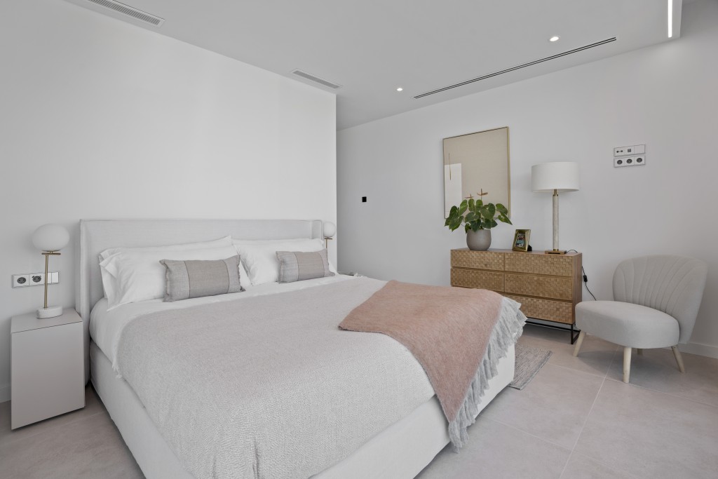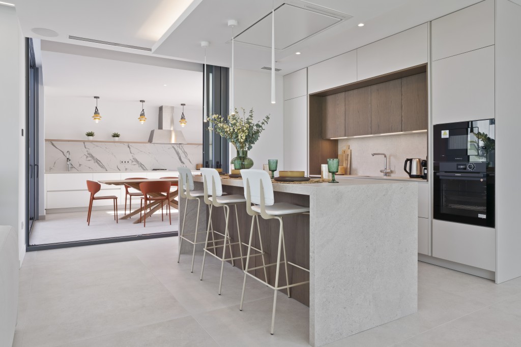 Las especificaciones interiores son inequívocamente de primera calidad. Suelos de porcelana Porcelanosa de gran formato, calefacción por suelo radiante en toda la vivienda, aire acondicionado frío-calor por conductos y un avanzado aislamiento térmico y acústico garantizan el confort durante todo el año. Las cocinas están totalmente equipadas con armarios de diseño y electrodomésticos de alta gama de Bosch, De Dietrich, Liebherr y Avintage, mientras que los baños cuentan con sanitarios suspendidos, duchas a ras de suelo, muebles integrados y acabados refinados que resultan elegantes y duraderos.